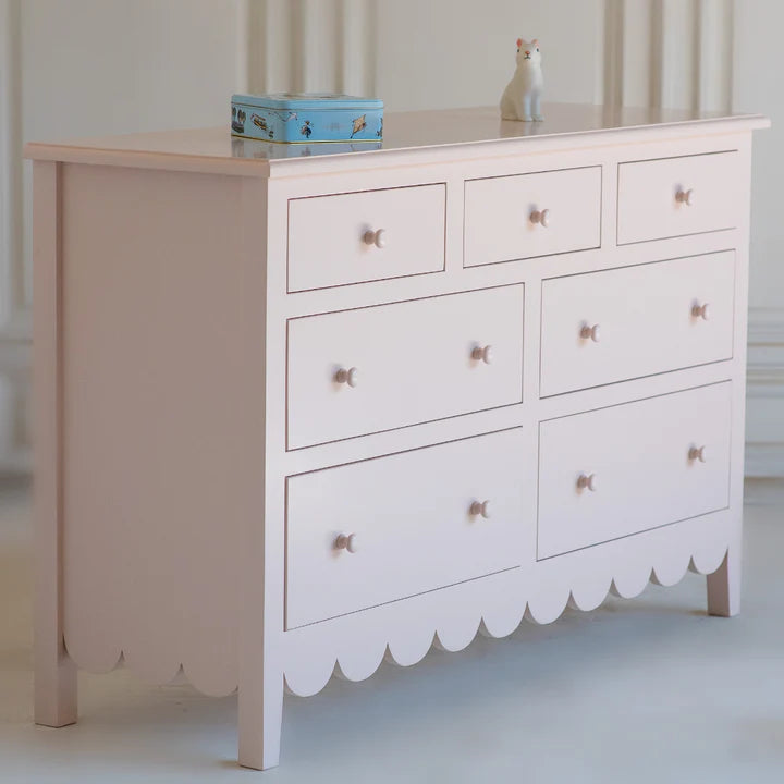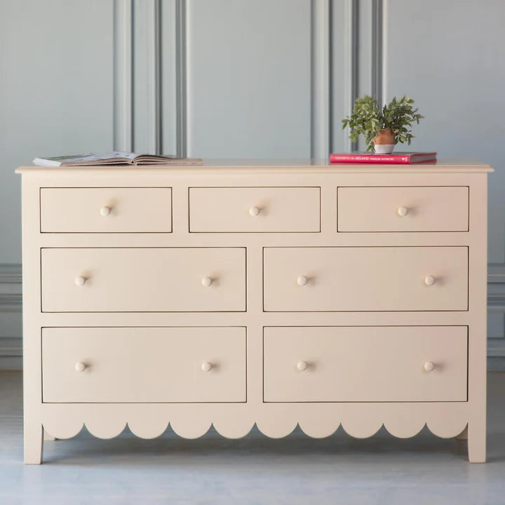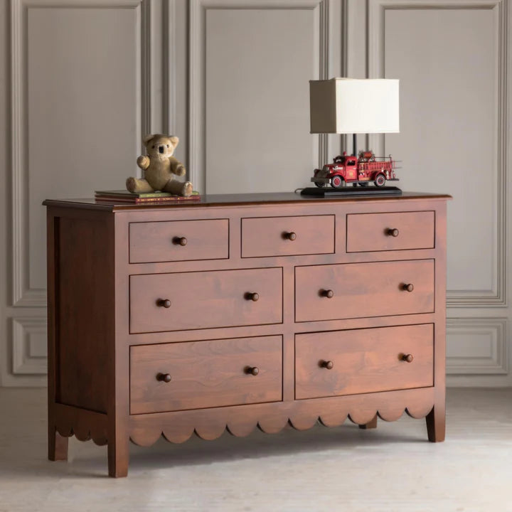 The Alice Chest of Drawers is a versatile storage solution made from Mango Wood and available in multiple finishes. It offers plenty of organization options with its well-designed layout, including a combination of drawer sizes to accommodate various storage needs. Its three small drawers keep essentials easily accessible, while the two medium and two spacious large drawers provide ample space for larger items. The curved design at the bottom adds sophistication and enhances the visual appeal. The Alice Chest of Drawers is the perfect blend of practicality and aesthetics, designed to elevate your living spaces. Choose from a carefully curated selection of finishes at Chuk Chuk Villa to seamlessly incorporate this piece into your decor.