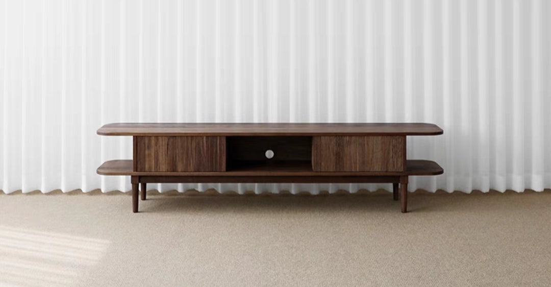 Bring timeless elegance and functionality to your living space with this handcrafted Mango Wood TV Cabinet Console in a natural satin matte finish. Designed with clean lines and modern detailing, it features three spacious compartments – a central open shelf for media devices and two side compartments with sliding fluted wooden doors for concealed storage.