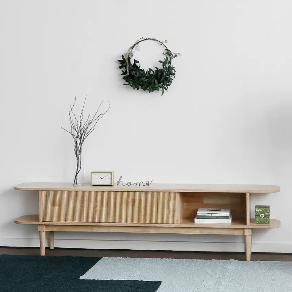 The curved side edges of the top surface add a soft, refined touch, while the tapered freestanding legs ensure durability and style. Perfectly balancing aesthetics with practicality, this media unit blends natural warmth with contemporary design, making it a statement piece for any home interior.