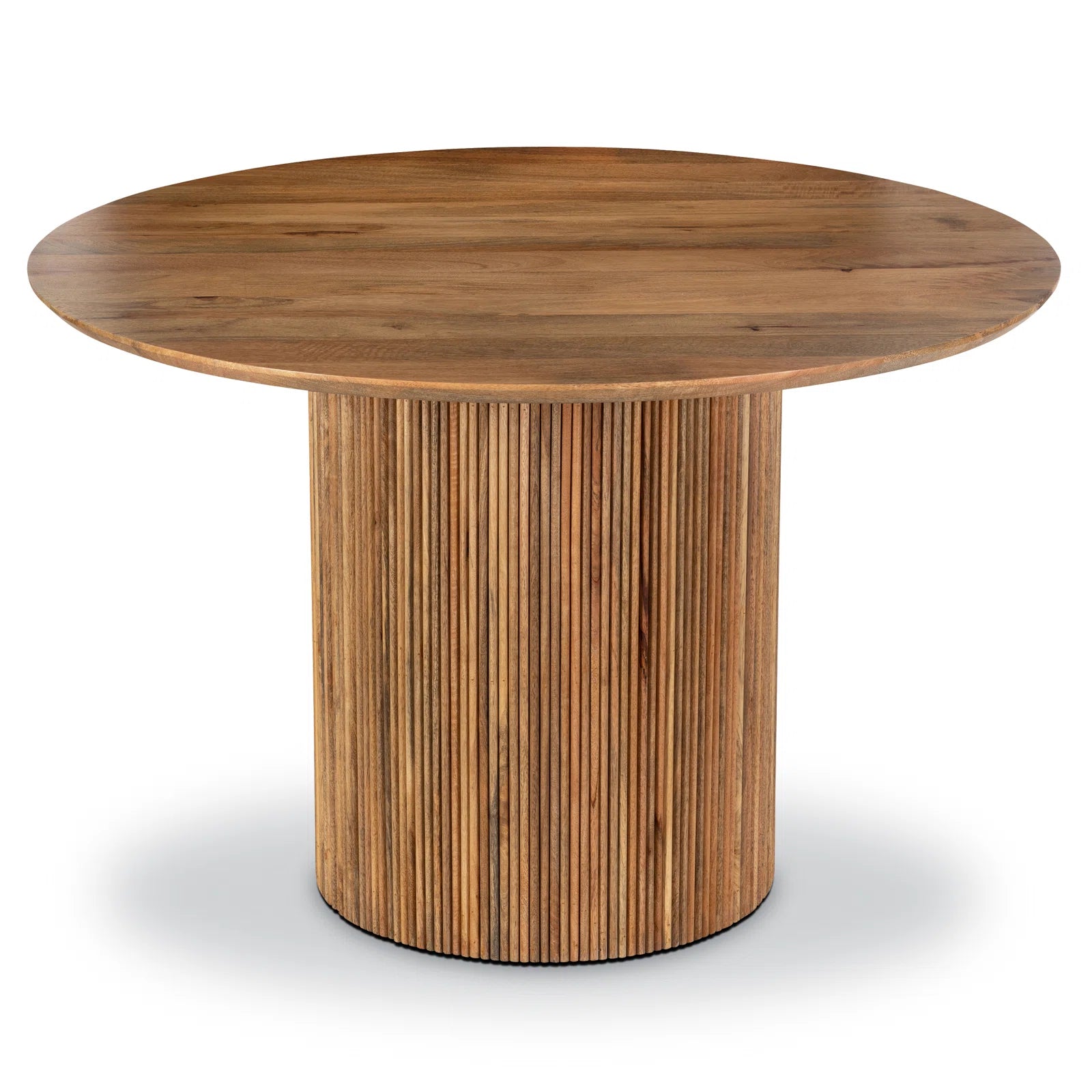 Invite your friends to admire the stunning elegance of the Natural Mango Solid Wood Round Dining Table 4 Seater. Crafted from kiln-dried mango wood, its solid table top showcases captivating wood grain variations. The exquisite wooden ribbed base adds a touch of dreamlike beauty to your dining area. Complete the look by pairing this round table with your choice of four wooden or fabric dining chairs for a truly spectacular ensemble.